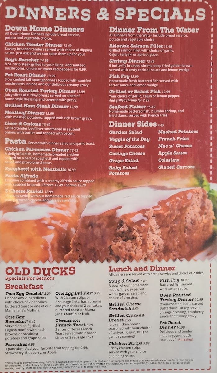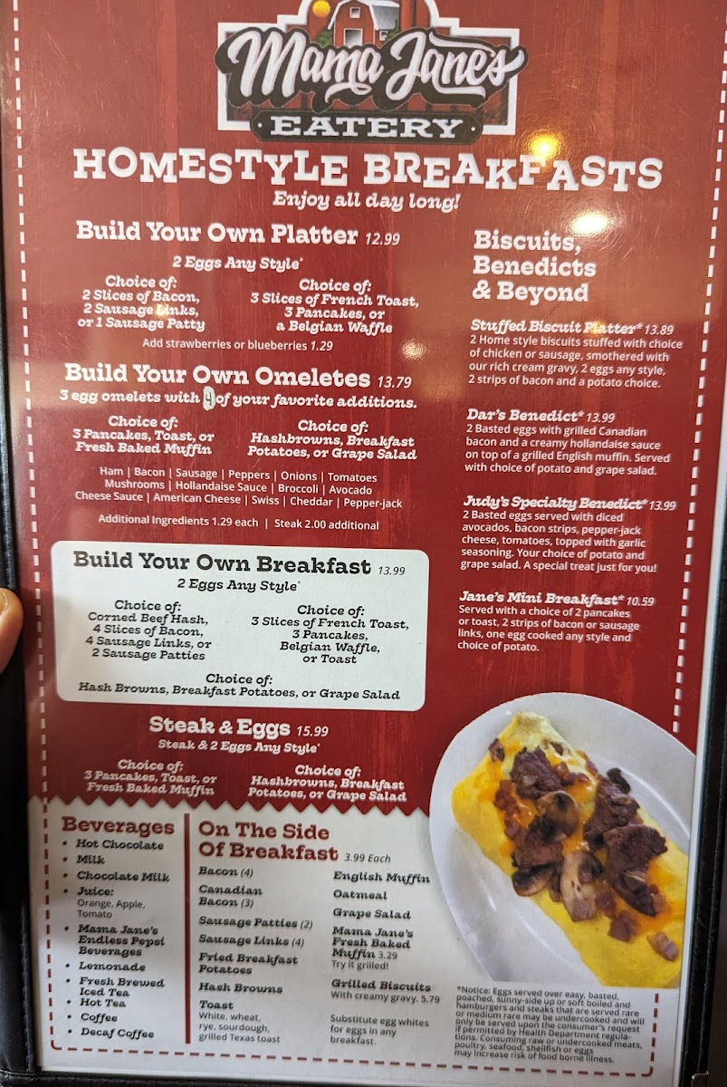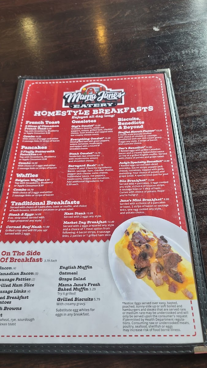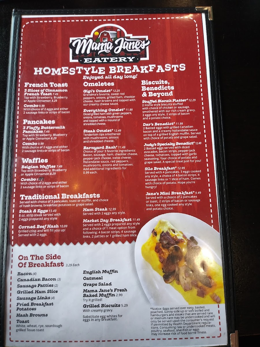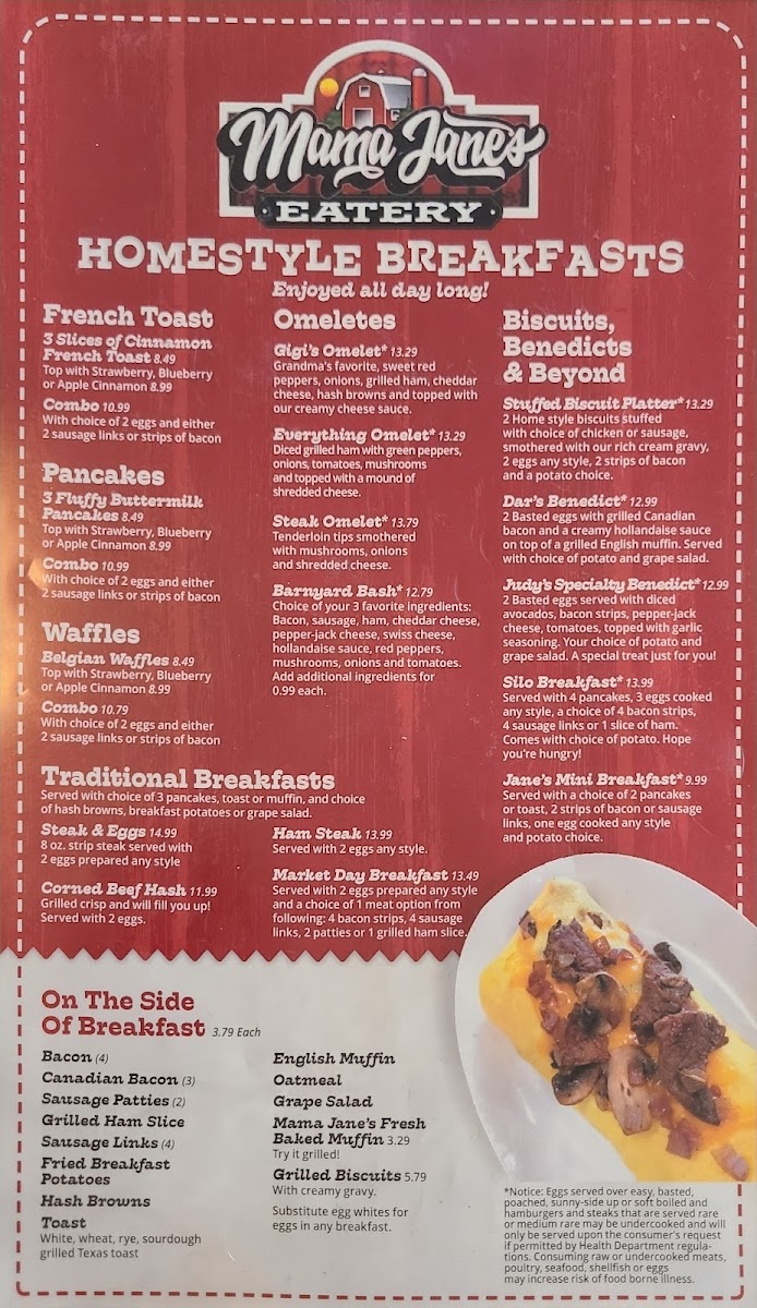 2 eggs* any style. With your choice of - 1.) either 3 sausage links, 2 sausage patties or 3 strips of bacon 2.) either 2 pancakes, 2 Slices of French Toast, Toast or Fresh Baked Muffin 3.) either Hash Browns, Breakfast Potatoes or Grape Salad *Notice: eggs served over easy, basted, poached, sunny-side up or soft boiled and hamburgers and steaks that are served rare or medium rare may be undercooked and will only be served upon the consumer's request if permitted by Health Department regulations. Consuming raw or undercooked meats, poultry, seafood, shellfish or eggs may increase the risk of foodborne illness.