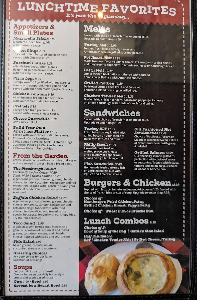 Our seasoned beef patty smothered with sautéed onions on grilled rye with American cheese. A favorite. Soup choices vary at each location, please call for exact soups if needed.